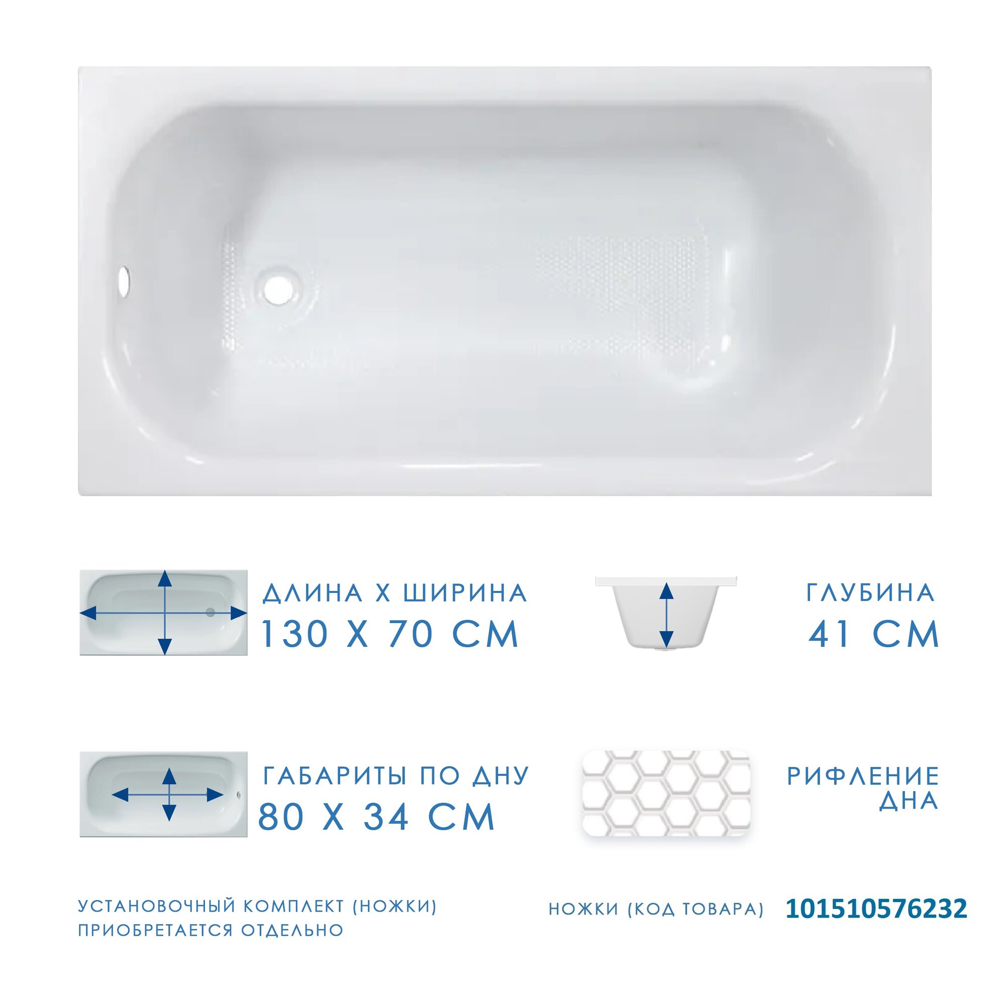 Ванна Тира, акрил, 150х70х45 см, регулировка ножек, противоскользящее дно, белая