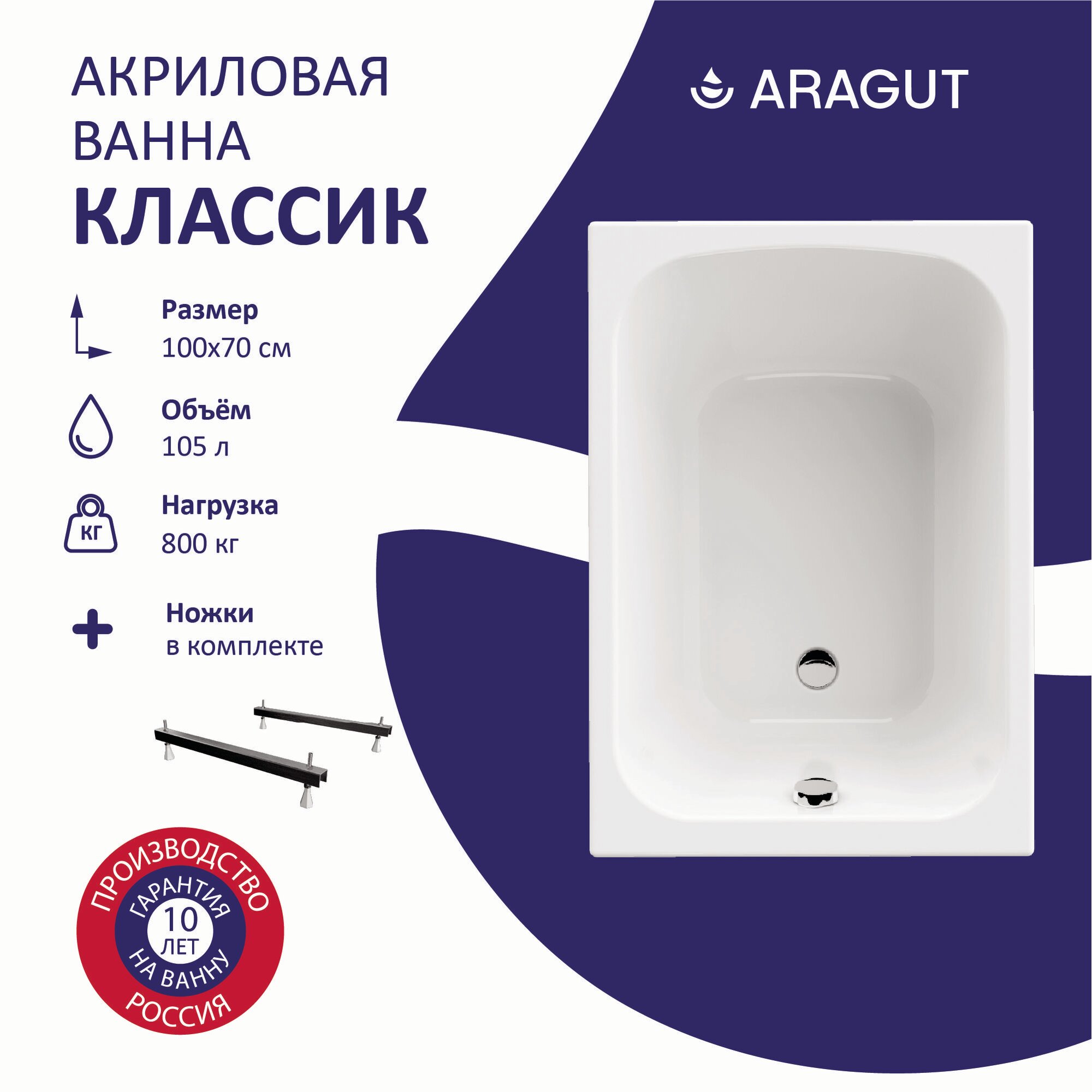 Акриловая ванна ARAGUT Классик 100х70 прямоугольная, в комплекте с ножками, белая информация: