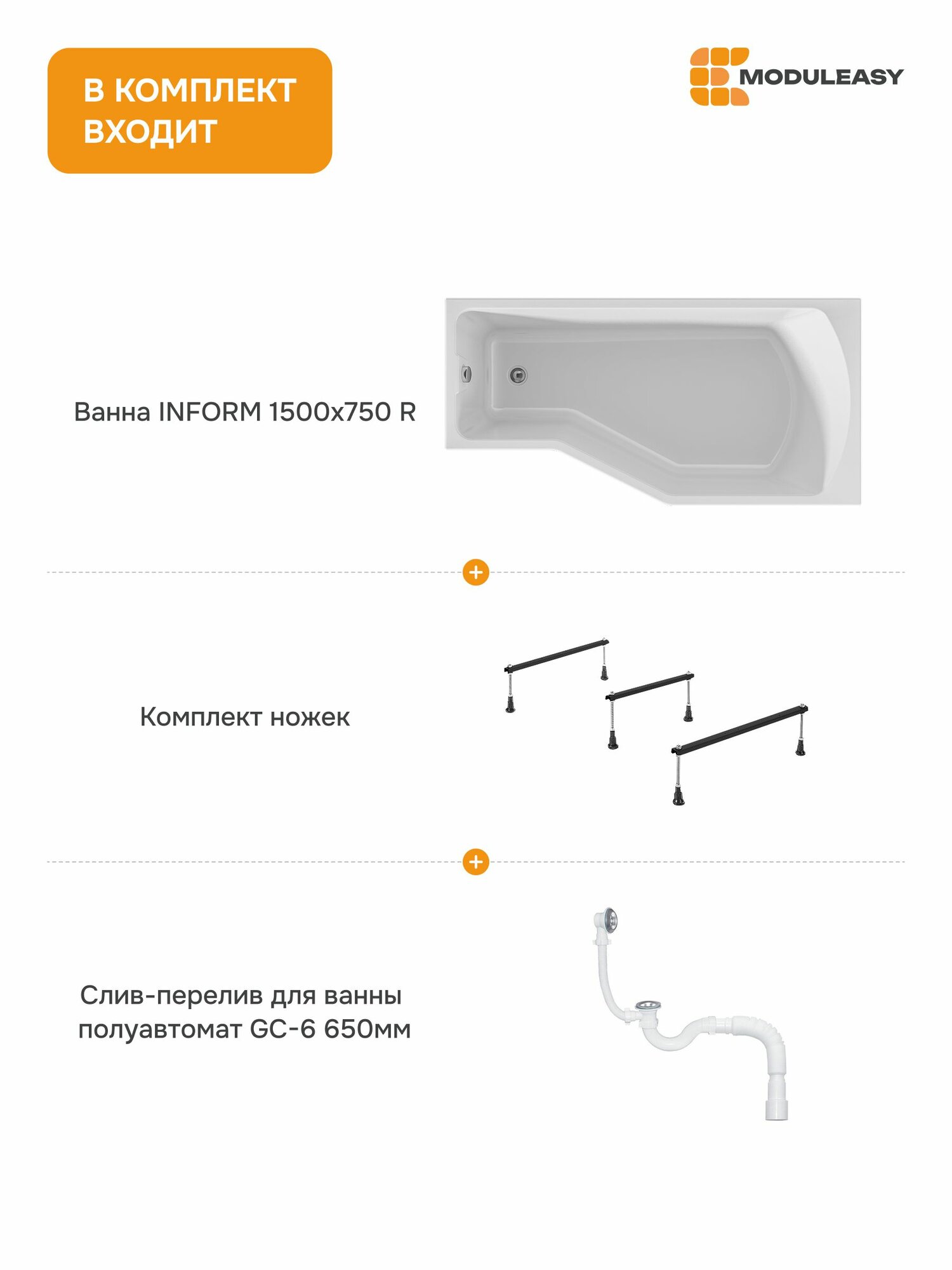 Отзывы на Ванна акриловая 150х75 см INFORM MODULEASY комплект 3в1: ванна правый угол, стальные ножки, слив-перелив 01инф1575пкс2+