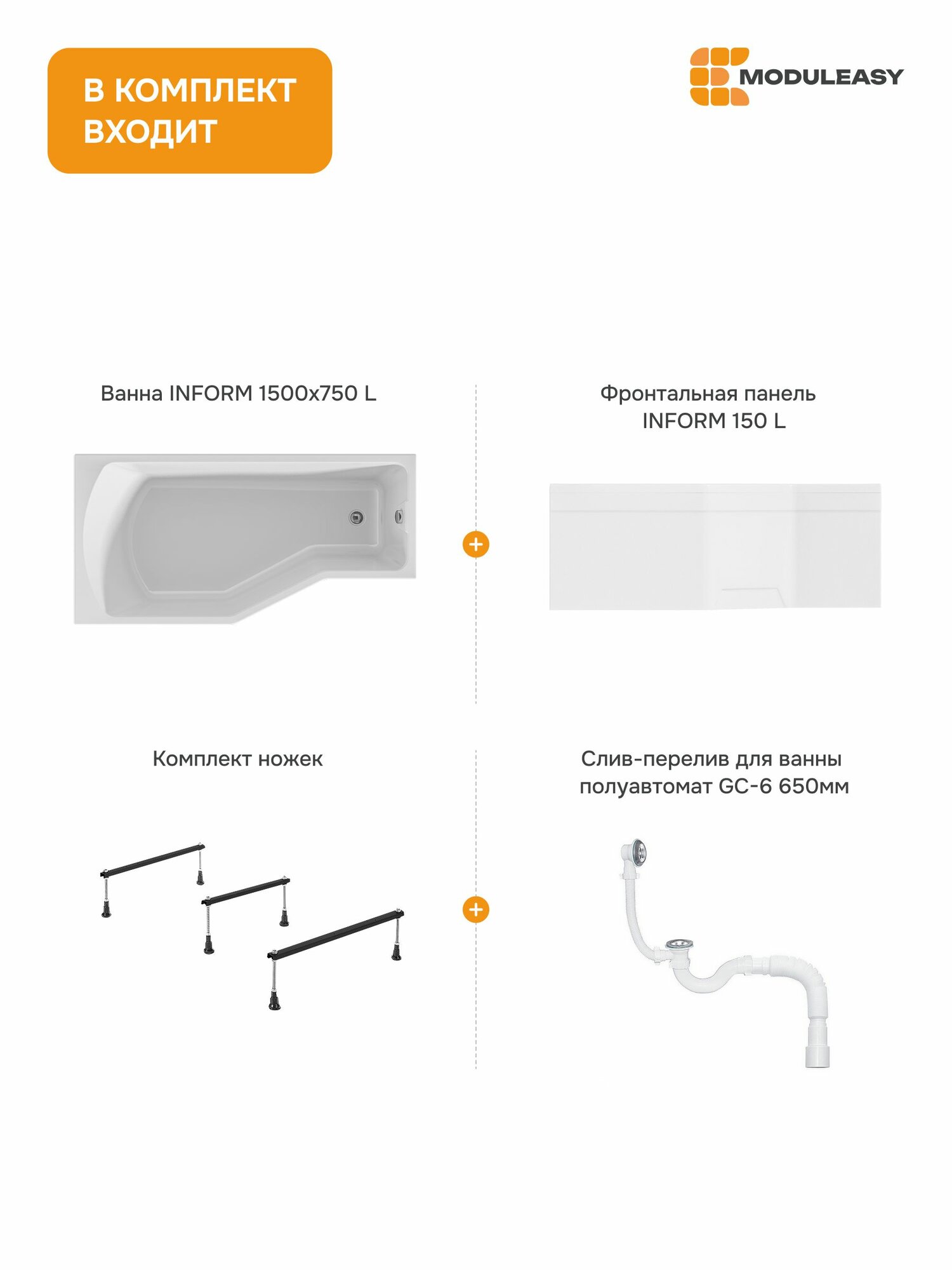 Ванна акриловая 150х75 см INFORM MODULEASY комплект 3в1: ванна левый угол, стальные ножки, слив-перелив 01инф1575лкс2+ 39 178 ₽