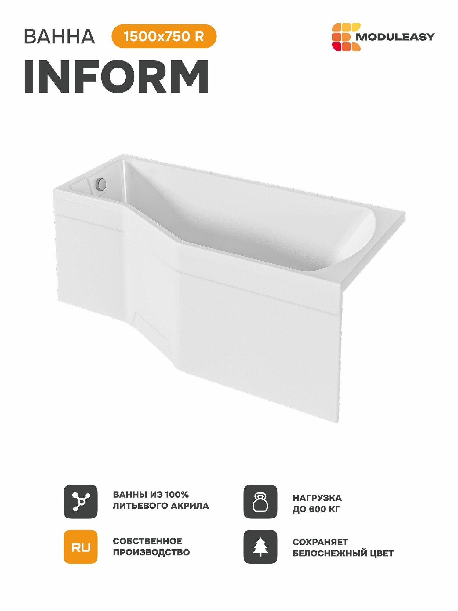 Ванна акриловая 150х75 см INFORM Асимметричная правый угол, 100% сантехнический акрил, MODULEASY 01инф1575п 35 354 ₽