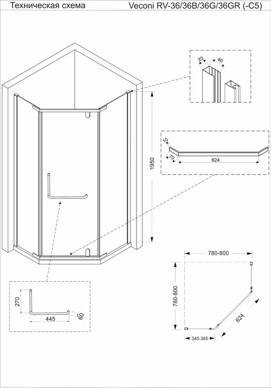Душевой уголок пятиугольный Veconi RV-36 100*100*195 см. профиль хром, прозрачное стекло 6 мм
