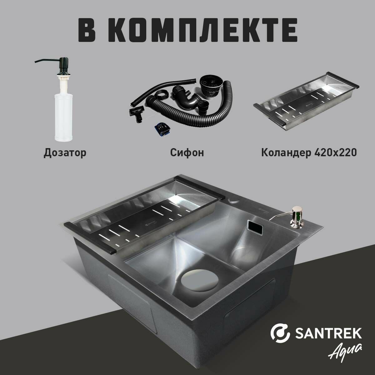 Отзывы на Мойка врезная из нержавеющей стали 500х500х220 мм т 3,0 сатин D5050HS (+сифон + дозатор + колландер 440х220 мм) SANTREK AQUA