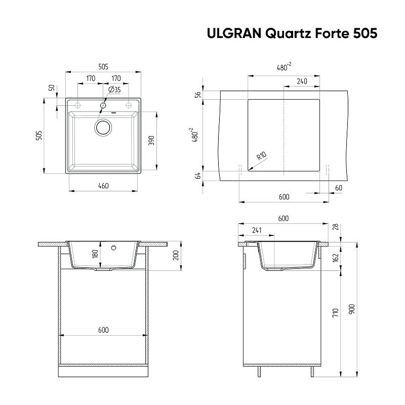 Кухонная мойка Ulgran Quartz Forte 505-09 Асфальт искусственный камень (литьевой мрамор) встраиваемый информация: