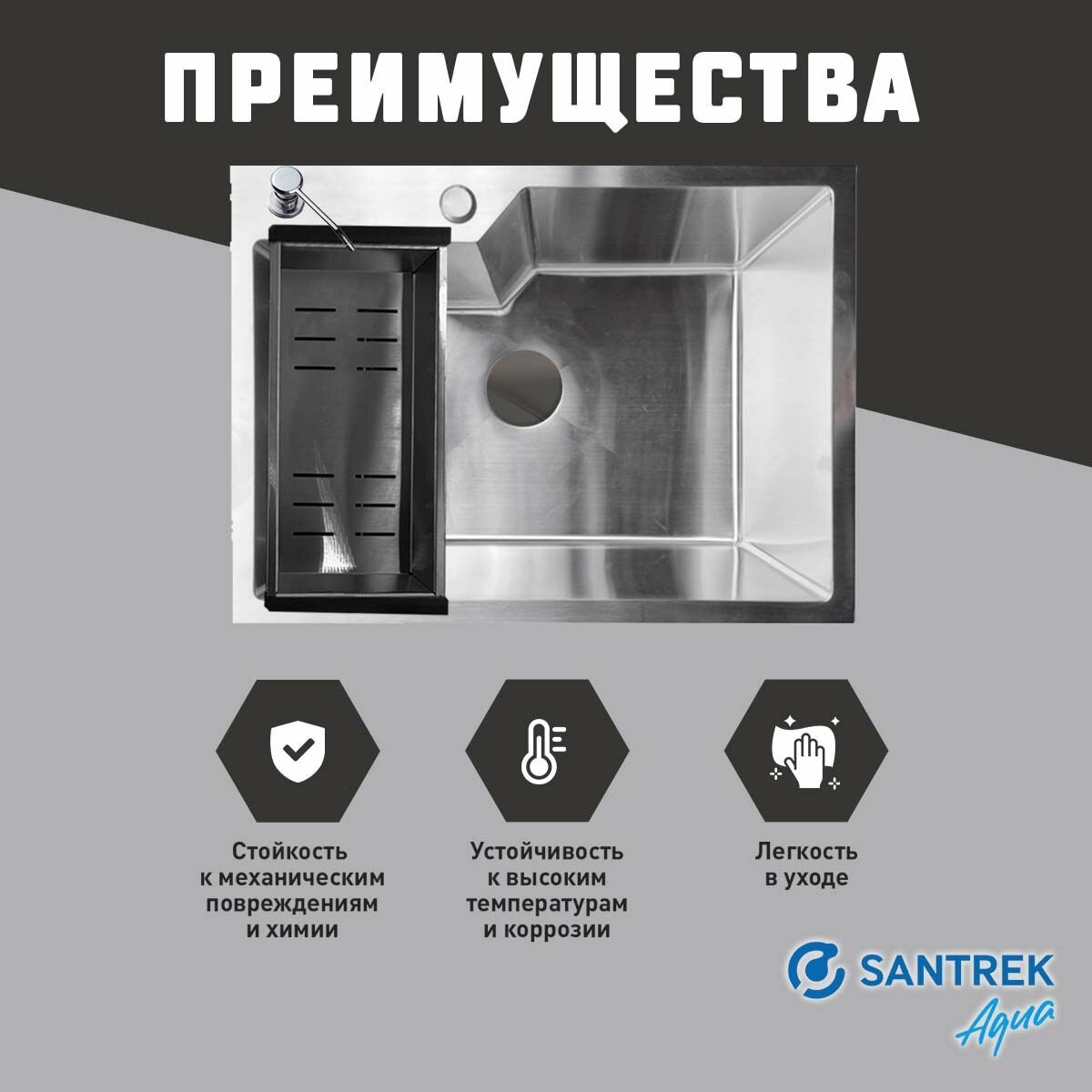 Мойка врезная из нержавеющей стали SANTREK AQUA 600х450х220 т 3,0 сатин D6045NS (+ сифон + дозатор + коландер 440х220) информация: