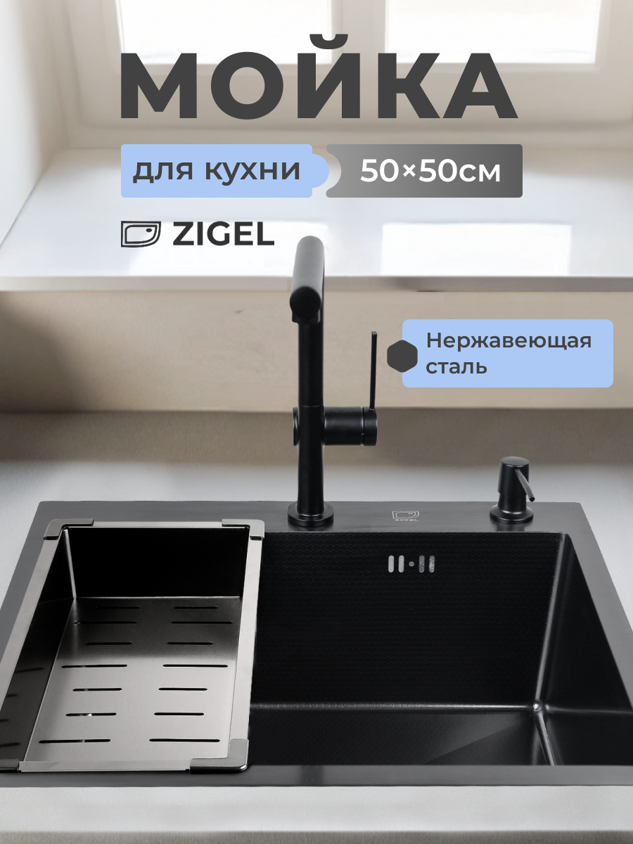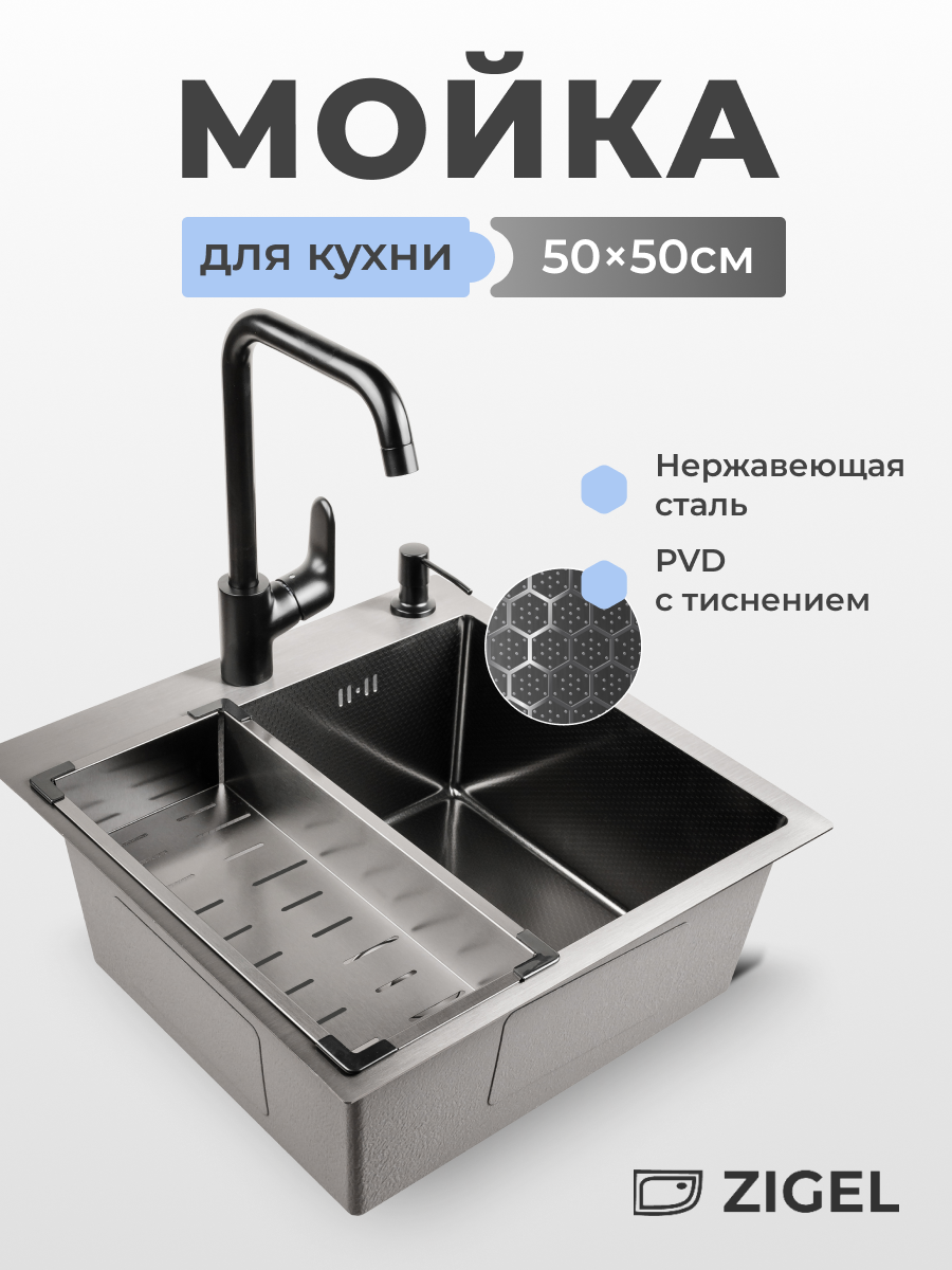 Отзывы на Мойка для кухни 50х50 из нержавеющей стали с pvd покрытием и тиснением, Графит