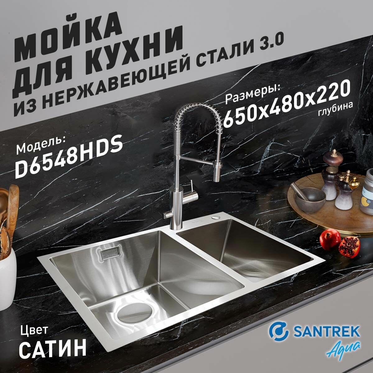 10 цен на Мойка врезная из нержавеющей стали SANTREK AQUA 650х480х220 т 3,0 1,5 чаши сатин D6548HDS (+ сифон +дозатор + коландер 460х220)