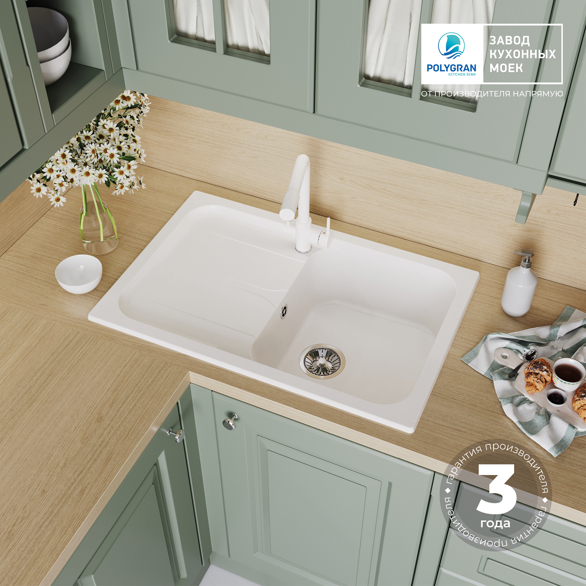 Отзывы на Мойка для кухни каменная POLYGRAN ALTO-780, Белая, Врезная, Квадратная, С крылом (Белый Хлопок)