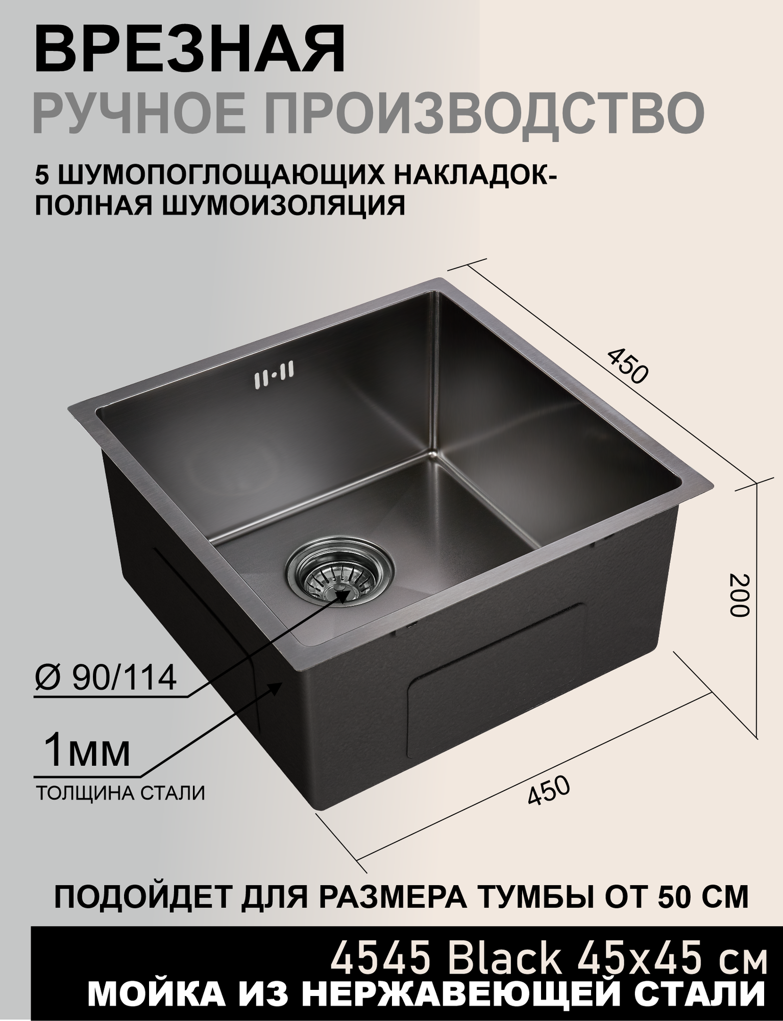 Отзывы на Мойка кухонная 45х45 см графит, нержавеющая сталь, квадратная, PVD покрытие
