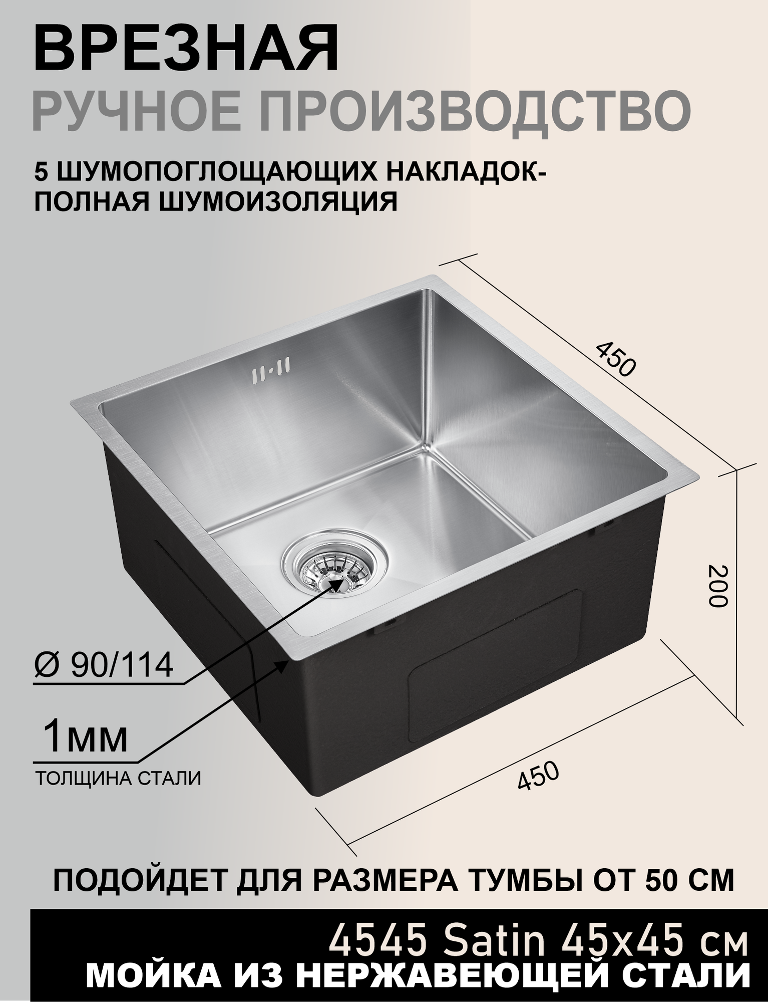 Мойка кухонная 45х45 см сатин, нержавеющая сталь, квадратная, PVD покрытие информация: