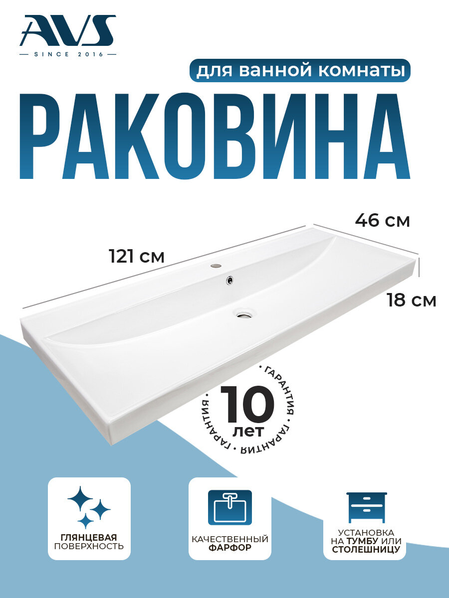 Раковина для ванной врезная AVS 121см x 46см, белая глянцевая, накладная на столешницу или тумбу информация: