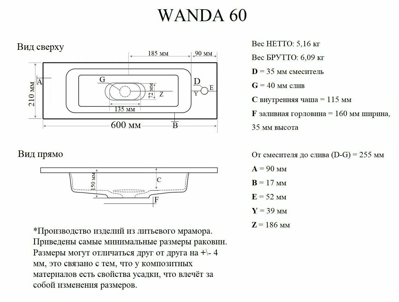Отзывы на Раковина для ванной комнаты "WANDA" 60х20 из литьевого мрамора JOYMY
