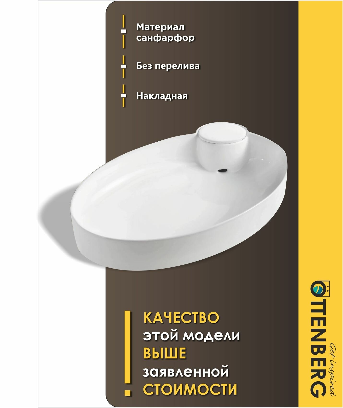 Отзывы на Раковина накладная в ванную со смещенным сливом овальная белая с встроенным донным клапаном Ottenberg, 60х30х12см
