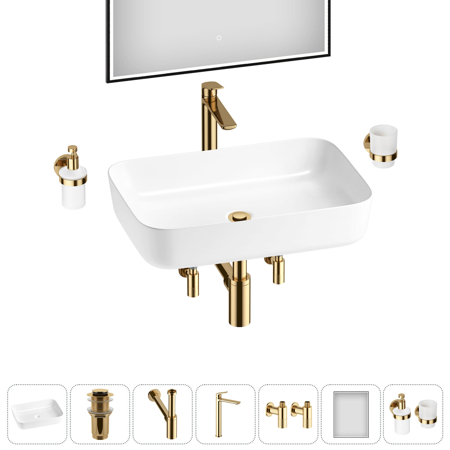 Накладная раковина в ванную комнату Wellsee Preen 20218311R в наборе 7 в 1: раковина 60 см в цвете белый глянец, донный клапан, сифон, смеситель, вентили, зеркало, аксессуары (цвет набора золото) информация: