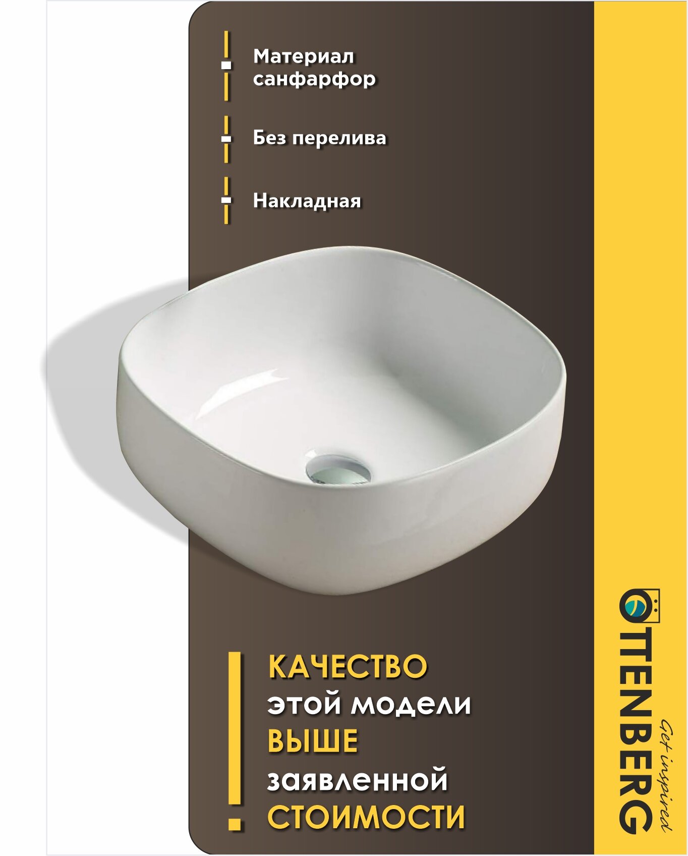 Отзывы на Раковина накладная для ванной прямоугольная белая Ottenberg, 46х35х15см