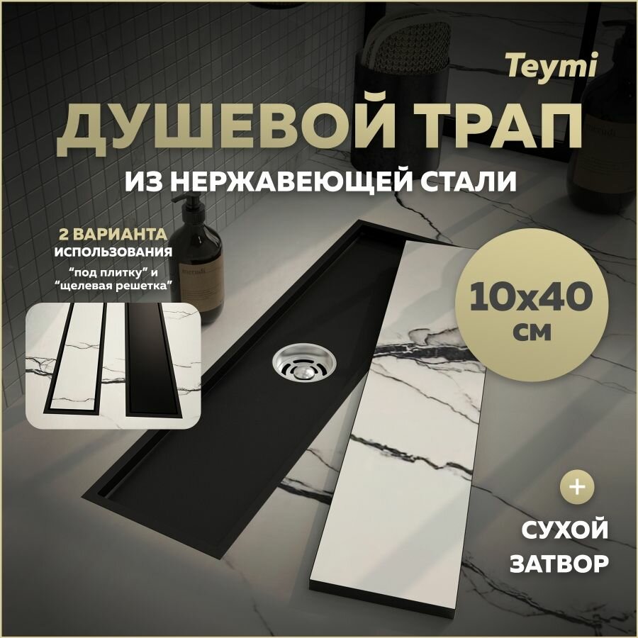 Трап для душа под плитку с сухим затвором вертикальный выпуск Teymi Aina 10х40 черный T90354 информация: