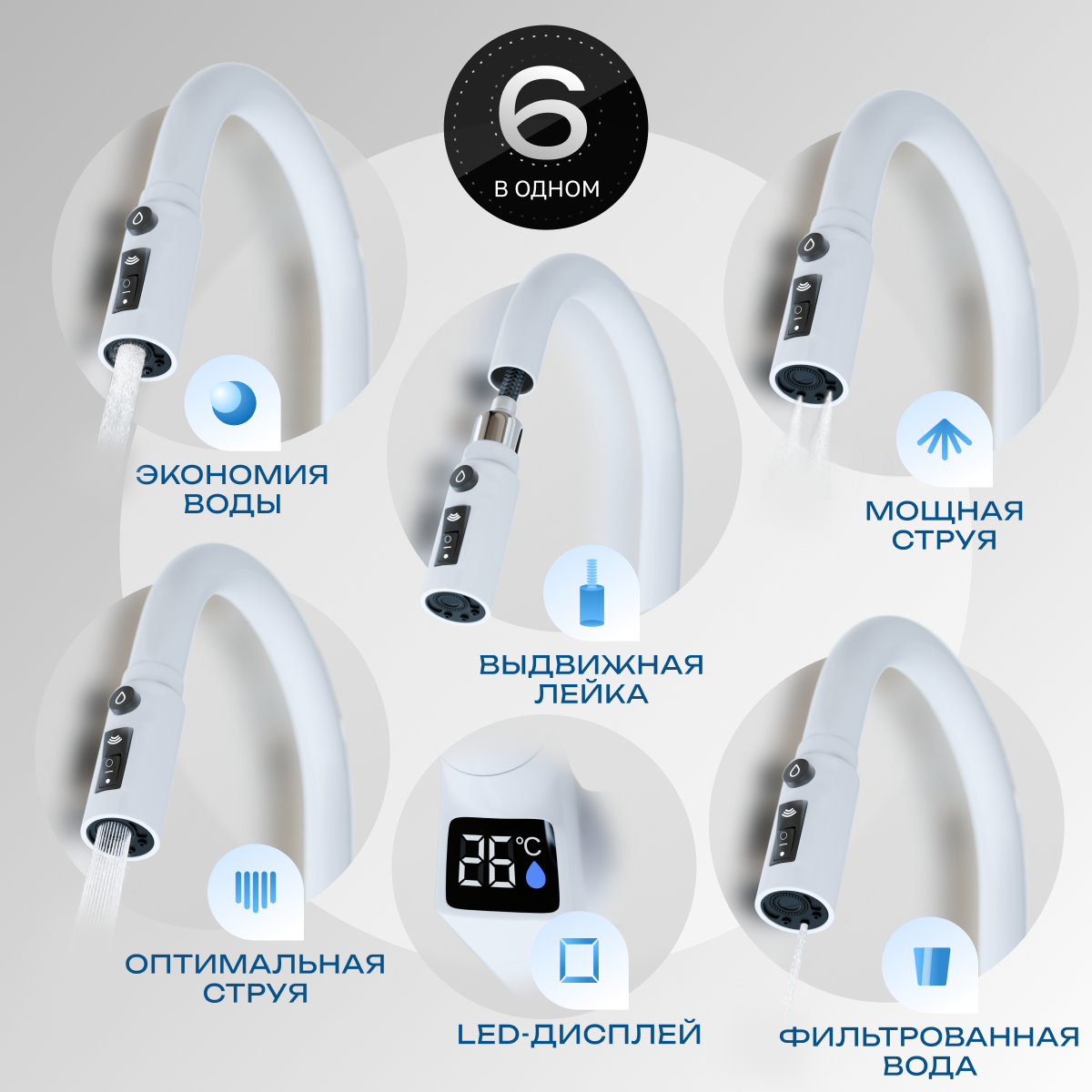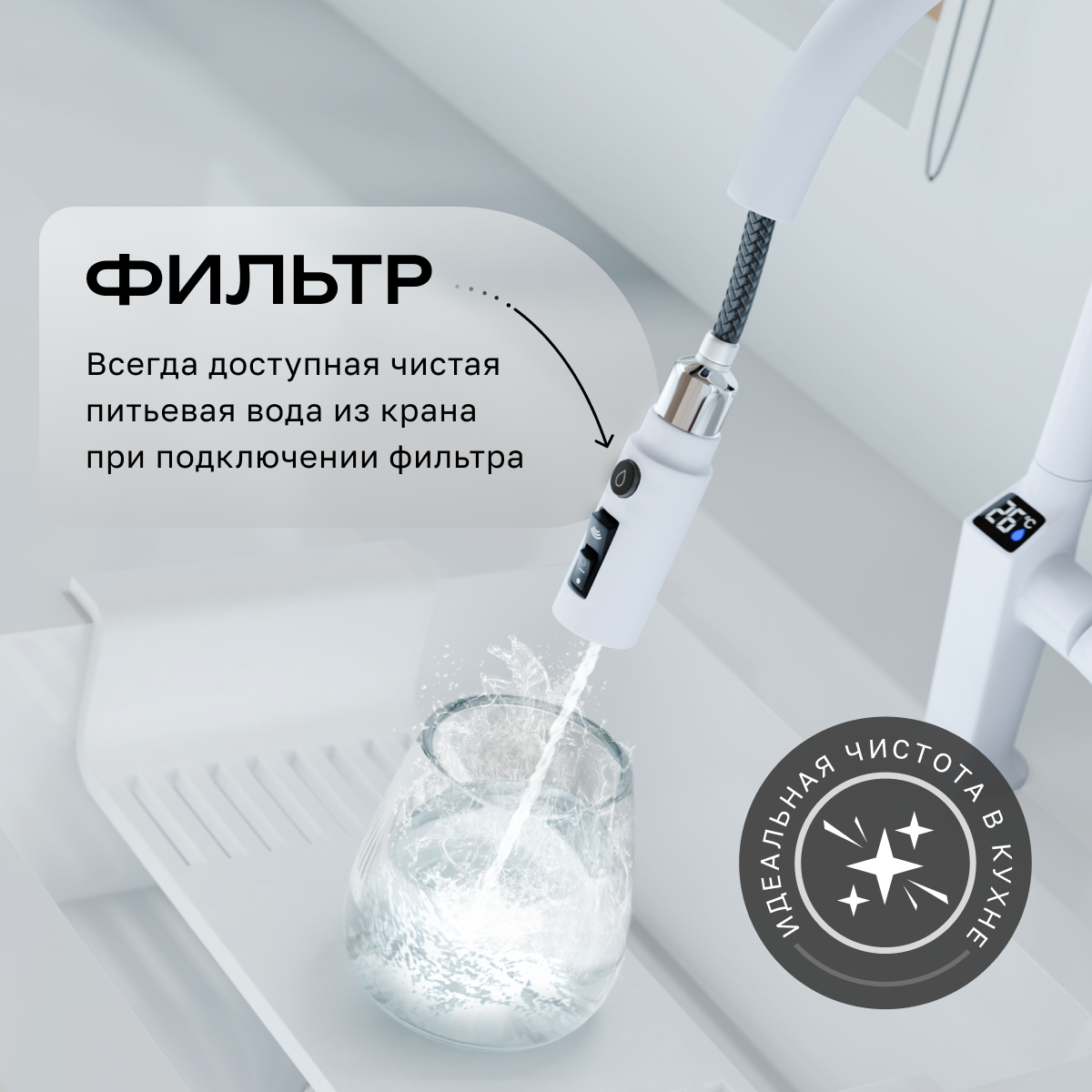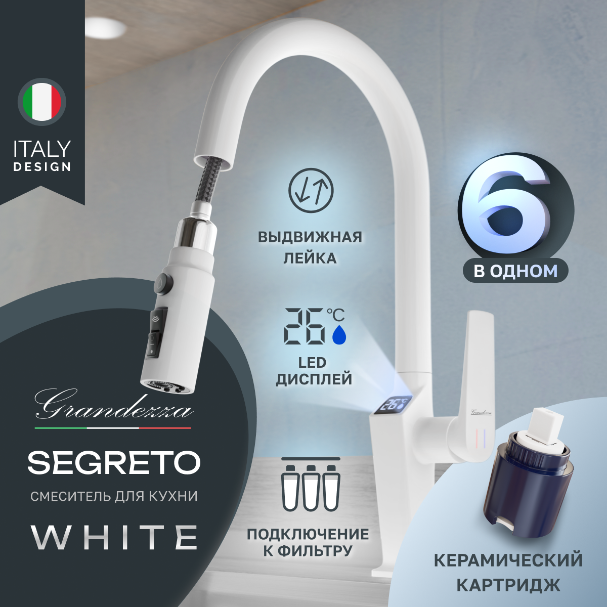 10 цен на Смеситель для кухни с выдвижной лейкой Grandezza Segreto White SW23 подключением фильтра питьевой воды и Led дисплеем (Белый)