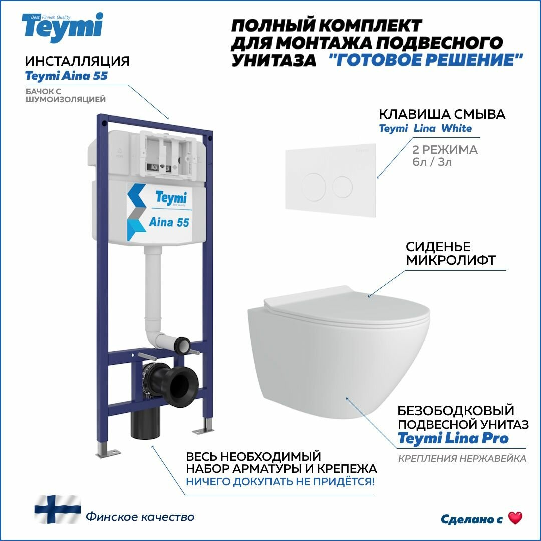 Инсталляция с унитазом комплект 5 в 1 Teymi унитаз подвесной безободковый Lina Pro кнопка белая F13871 информация: