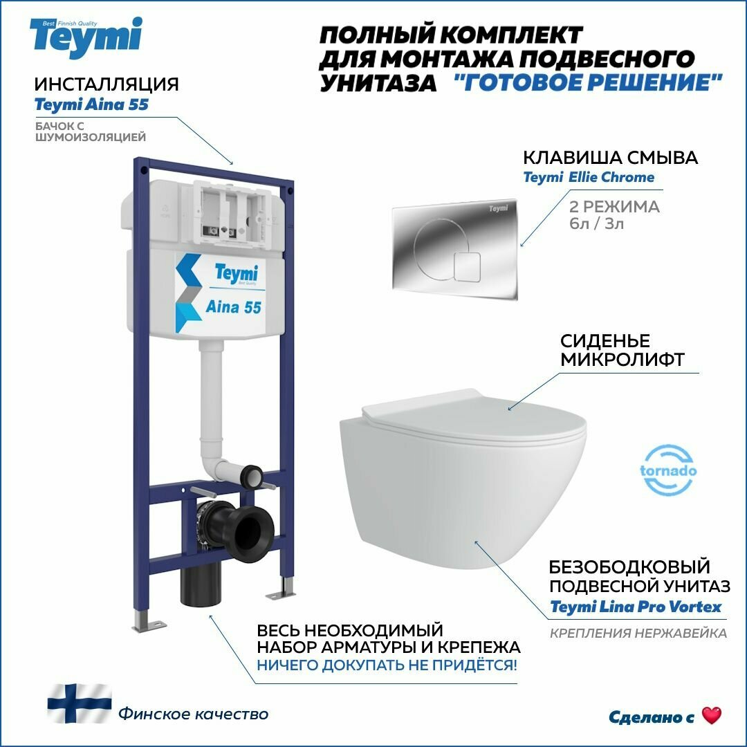 Инсталляция с унитазом комплект 5 в 1 Teymi унитаз подвесной безободковый торнадо Lina Pro Vortex кнопка хром F14511 информация: