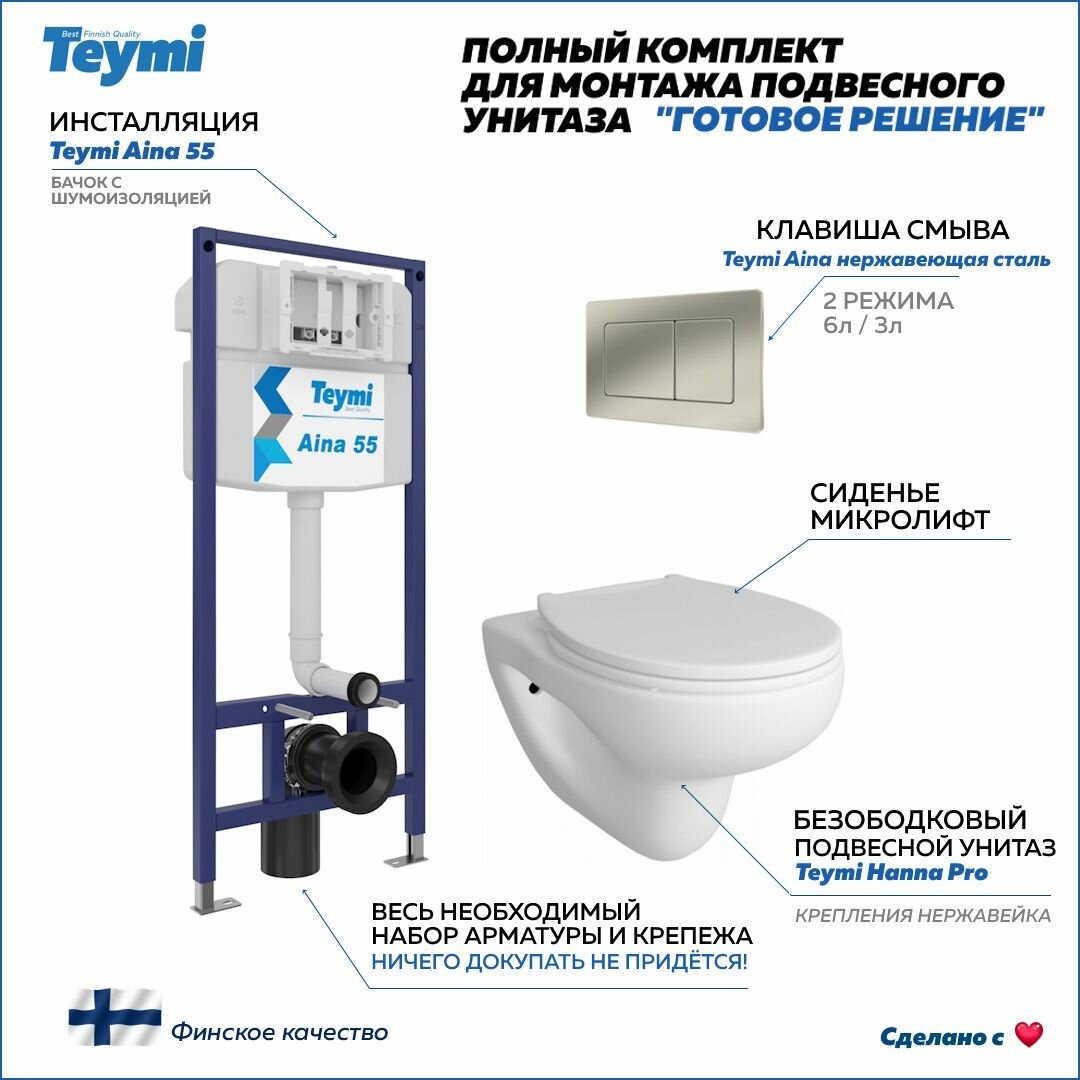Инсталляция с унитазом комплект 5 в 1 Teymi унитаз подвесной безободковый Hanna Pro кнопка нержавеющая сталь F13729 информация: