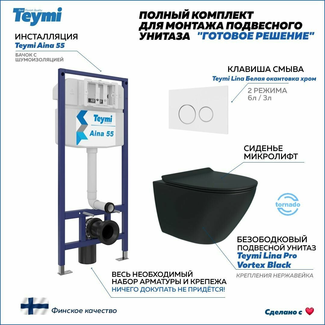 Инсталляция с унитазом комплект 5 в 1 Teymi унитаз подвесной безободковый торнадо черный Lina Pro Vortex Black кнопка белая / хром F15014 информация: