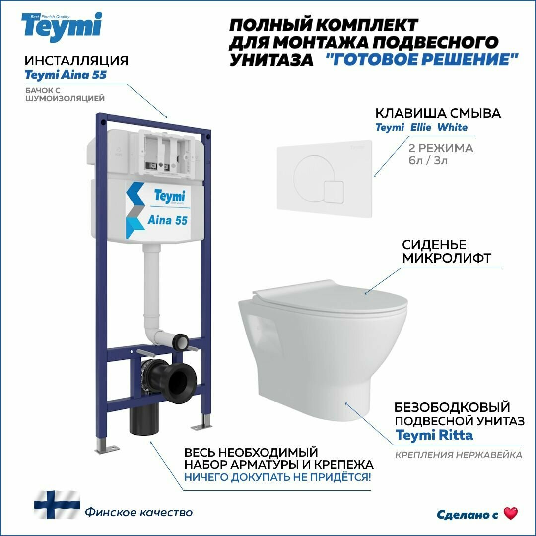 Отзывы на Инсталляция с унитазом комплект 5 в 1 Teymi унитаз подвесной безободковый Ritta кнопка белая F13854