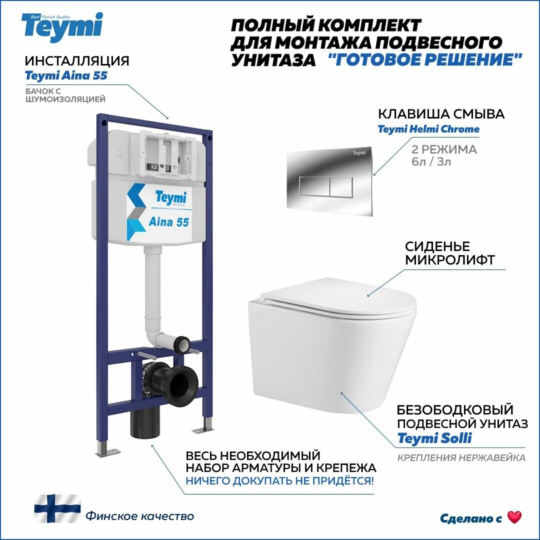 10 цен на Инсталляция с унитазом комплект 5 в 1 Teymi унитаз подвесной безободковый Solli кнопка хром F13532