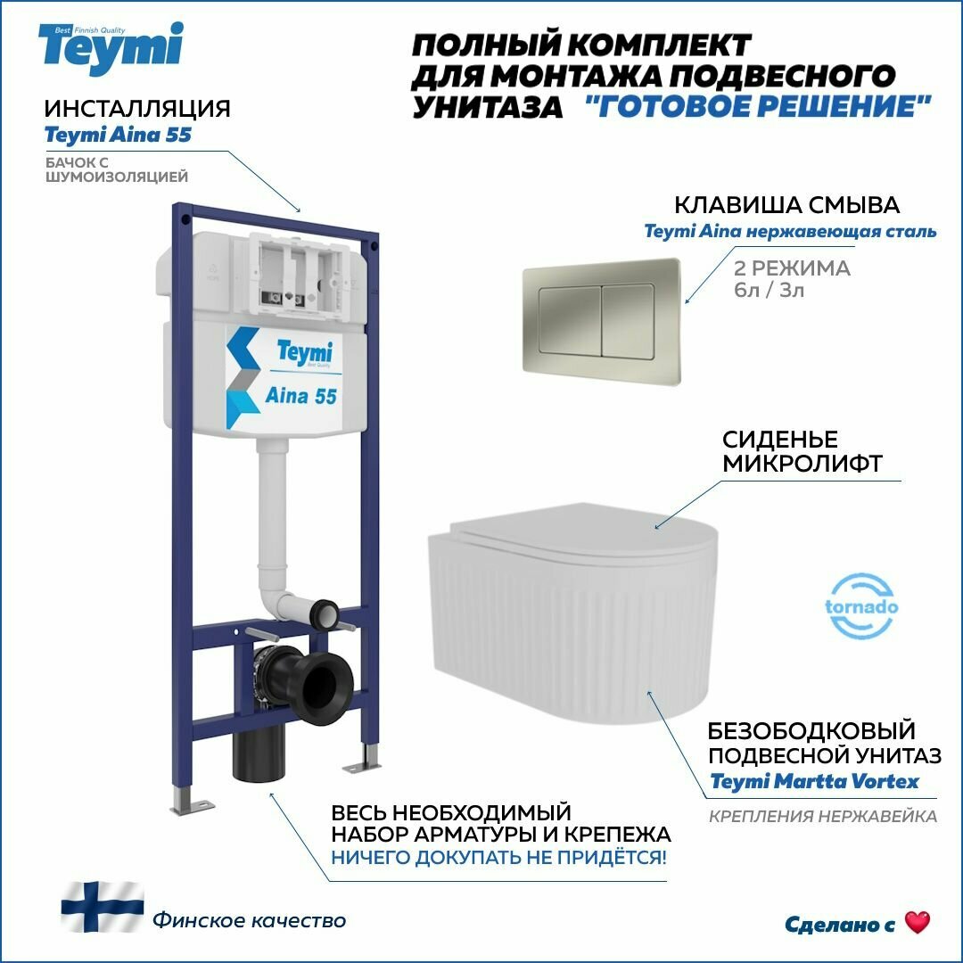 Инсталляция с унитазом комплект 5 в 1 Teymi унитаз подвесной безободковый торнадо Martta Vortex кнопка нержавеющая сталь F14573 информация: