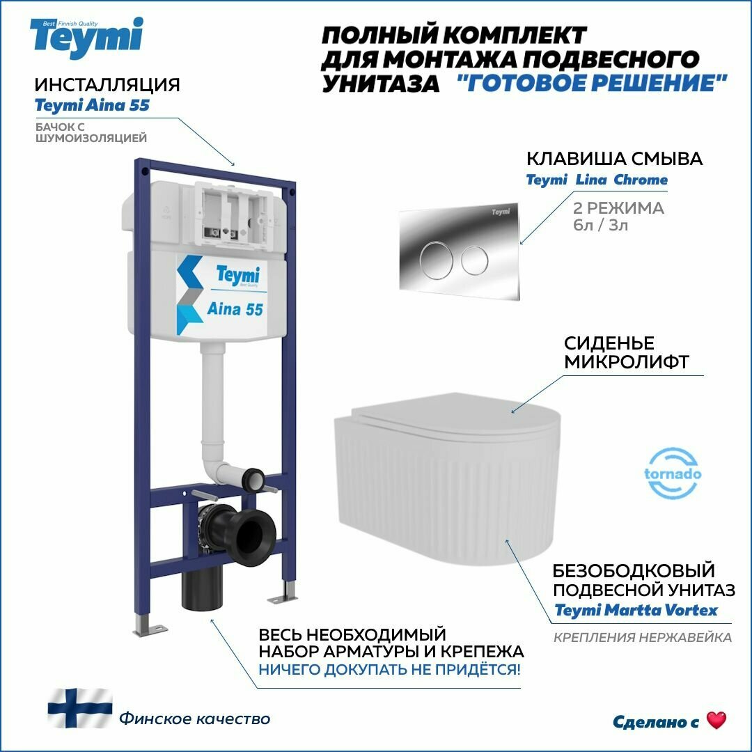 Инсталляция с унитазом комплект 5 в 1 Teymi унитаз подвесной безободковый торнадо Martta Vortex кнопка хром F14564 информация: