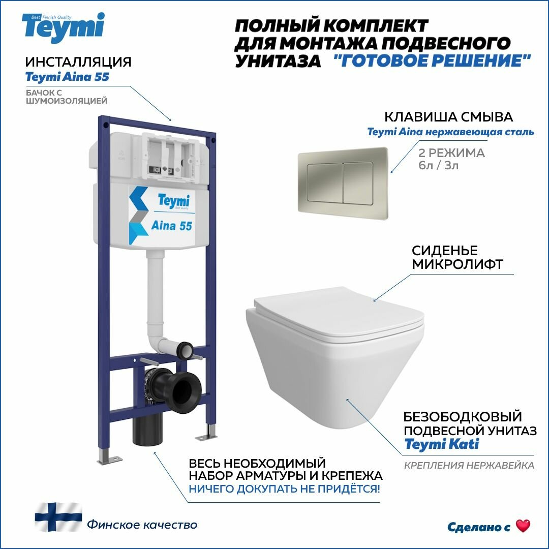Отзывы на Инсталляция с унитазом комплект 5 в 1 Teymi унитаз подвесной безободковый Kati кнопка нержавеющая сталь F13707
