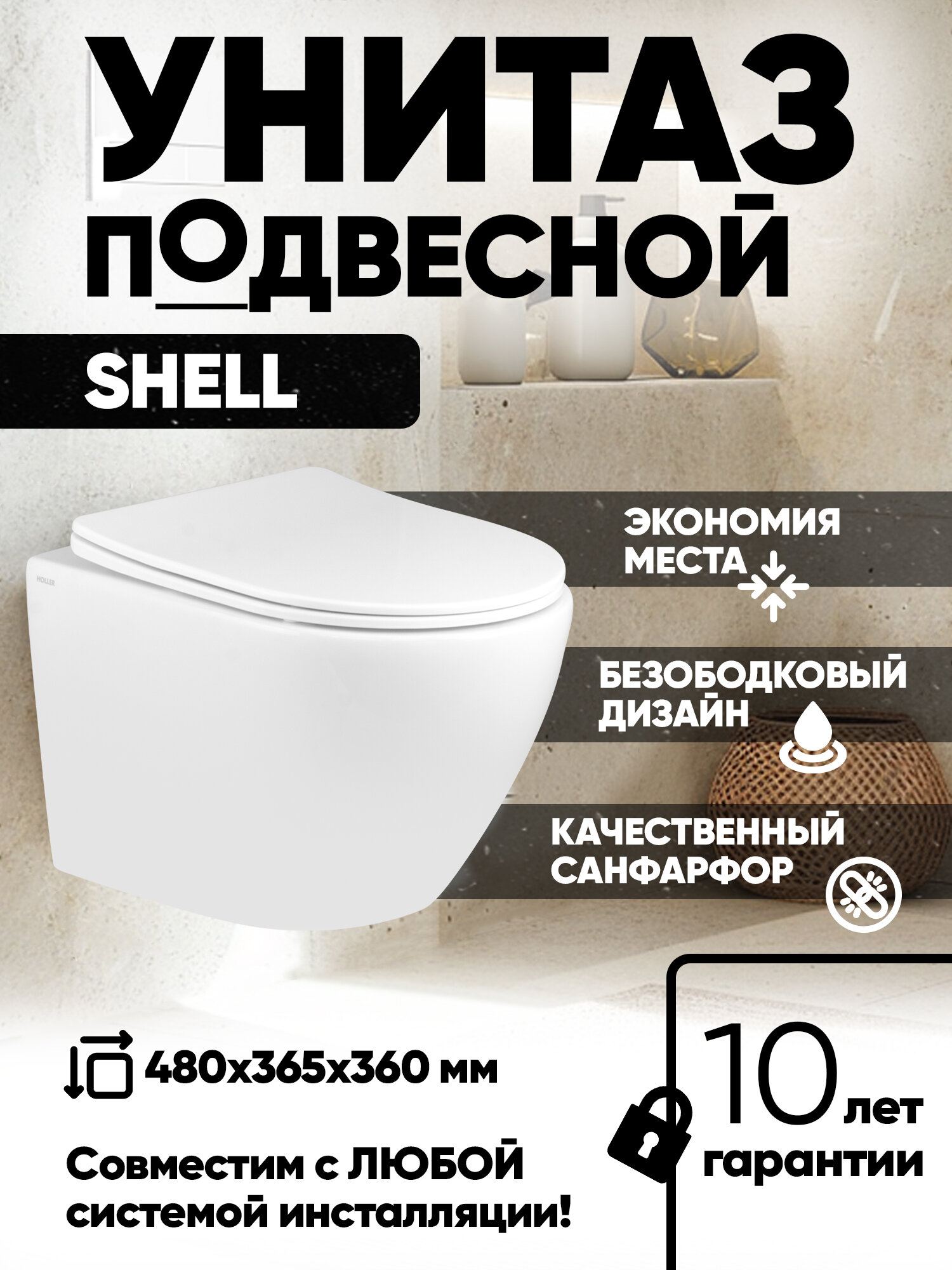 10 цен на Унитаз подвесной безободковый SHELL (480*365*360мм, сиденье дюропласт, микролифт) белый