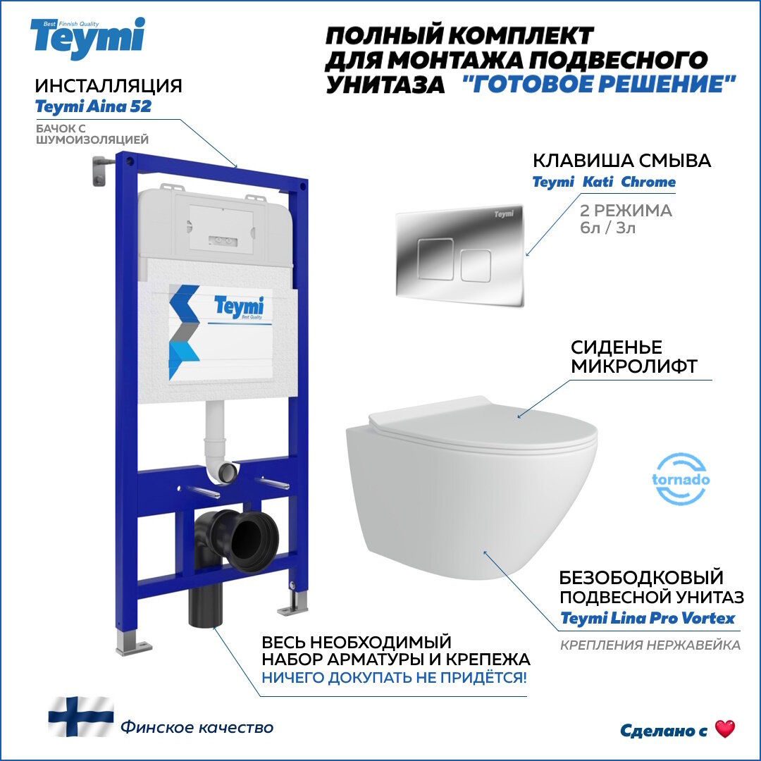 Отзывы на Инсталляция с унитазом комплект 5 в 1 Teymi унитаз подвесной безободковый торнадо Lina Pro Vortex кнопка хром F14464