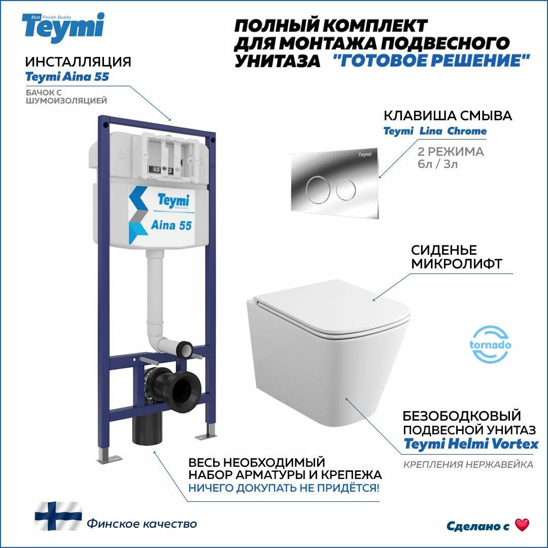 Инсталляция с унитазом комплект 5 в 1 Teymi унитаз подвесной безободковый торнадо Helmi Vortex кнопка хром F13600 информация: