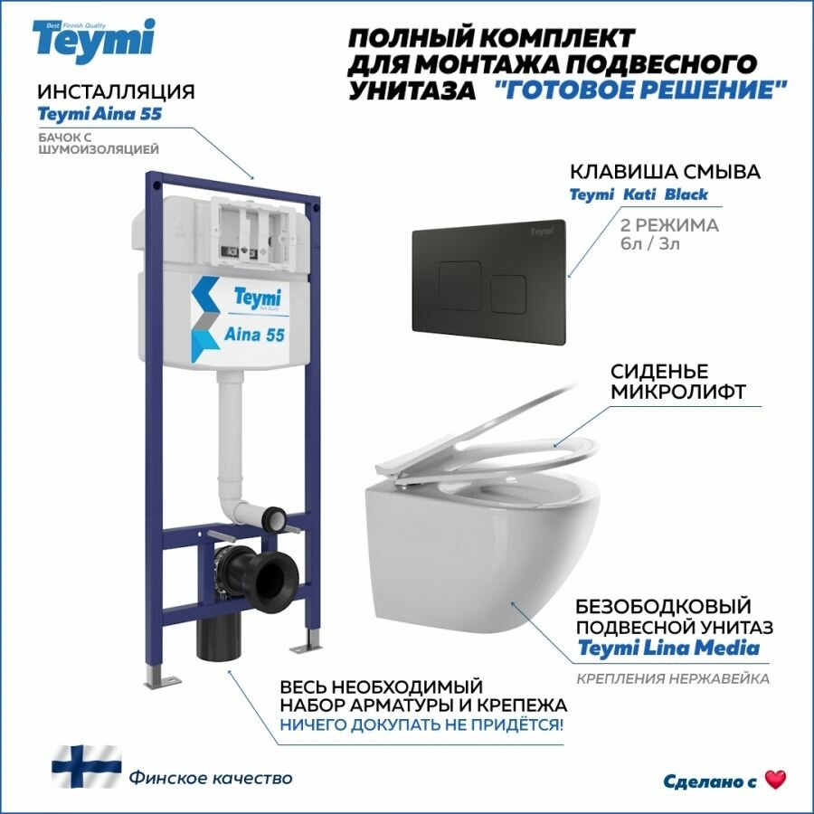 Инсталляция с унитазом комплект 5 в 1 Teymi унитаз подвесной безободковый Lina Media кнопка черная F13671 информация: