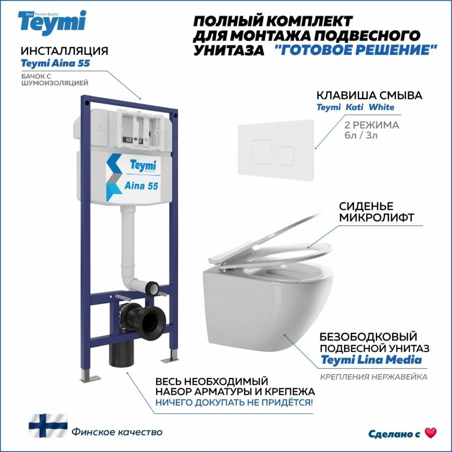 Инсталляция с унитазом комплект 5 в 1 Teymi унитаз подвесной безободковый Lina Media кнопка белая F13675 информация: