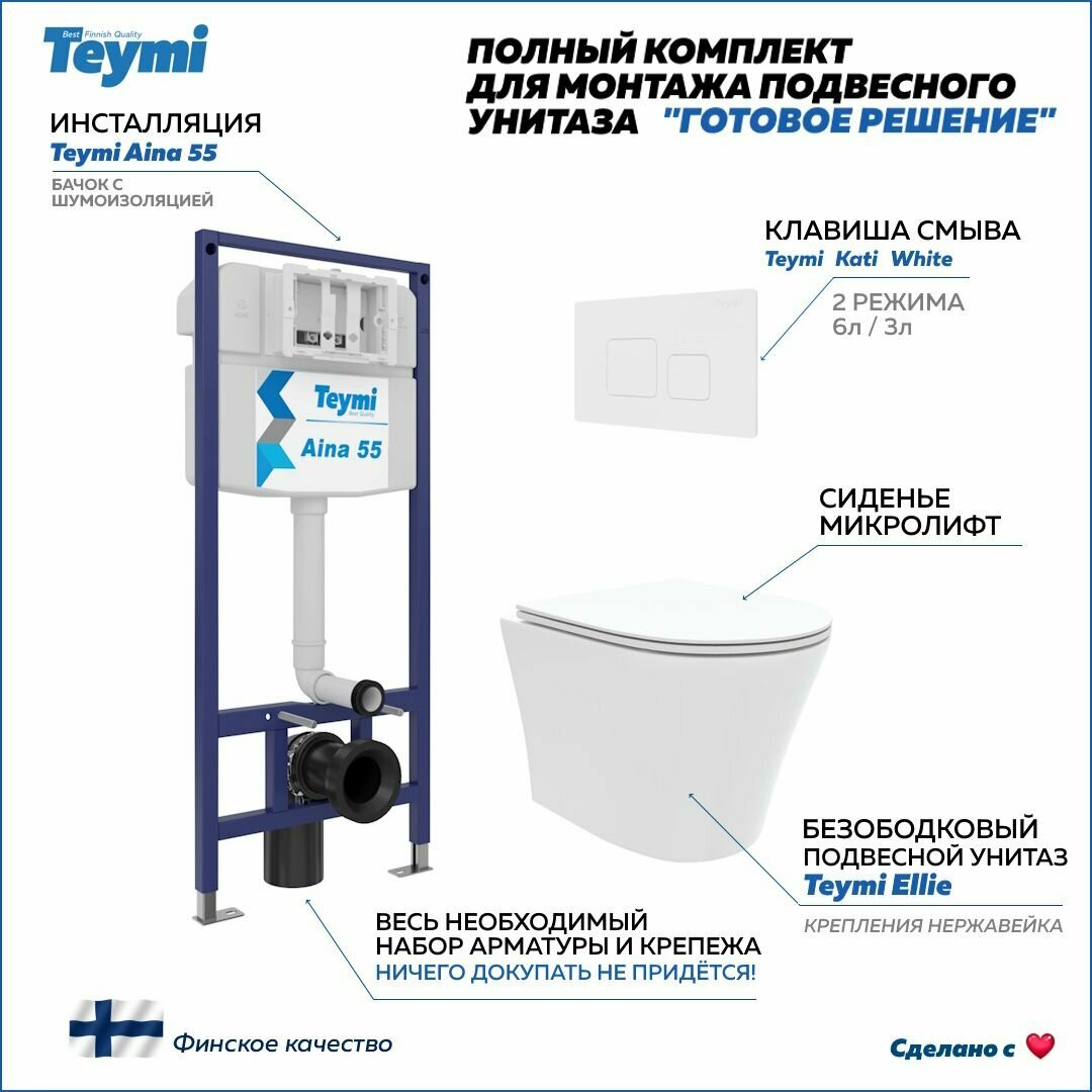 Инсталляция с унитазом комплект 5 в 1 Teymi унитаз подвесной безободковый Ellie кнопка белая F13653 информация: