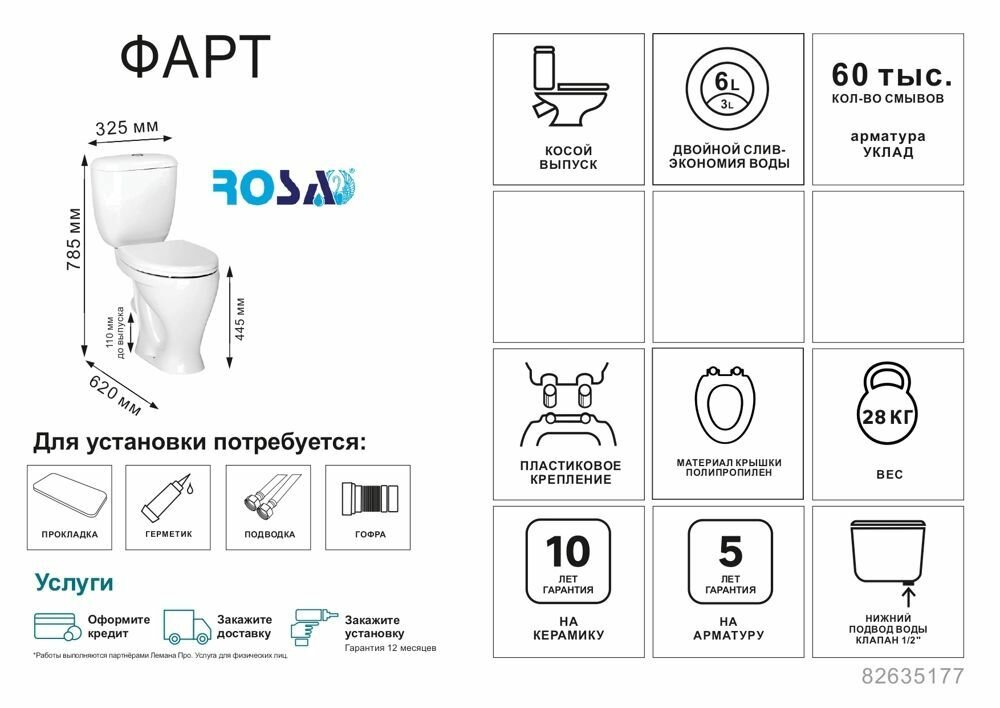 Роса Фарт унитаз-компакт белый / Rosa Фарт унитаз-компакт косой выпуск двойной слив белый информация: