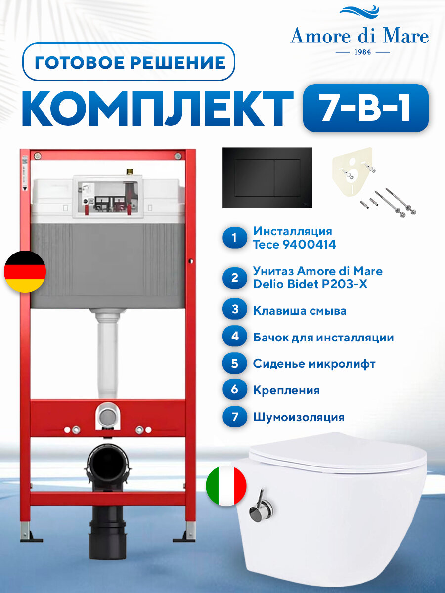 Комплект 7 в 1: инсталляция Tece 9400414 + подвесной безободковый унитаз Amore di Mare Delio Bidet P203-X + сиденье микролифт, бачок, крепления информация: