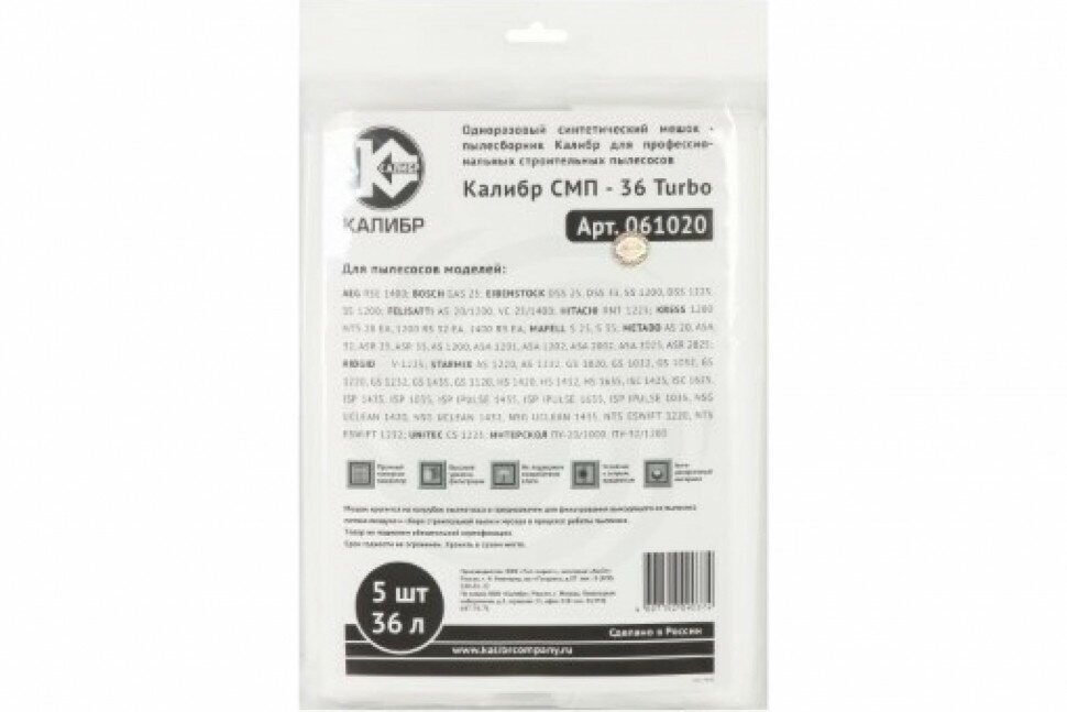 Калибр СМП-36 Turbo для профессиональных пылесосов до 36л. 5шт.(уп) 67211 (Мешки пылесборники)