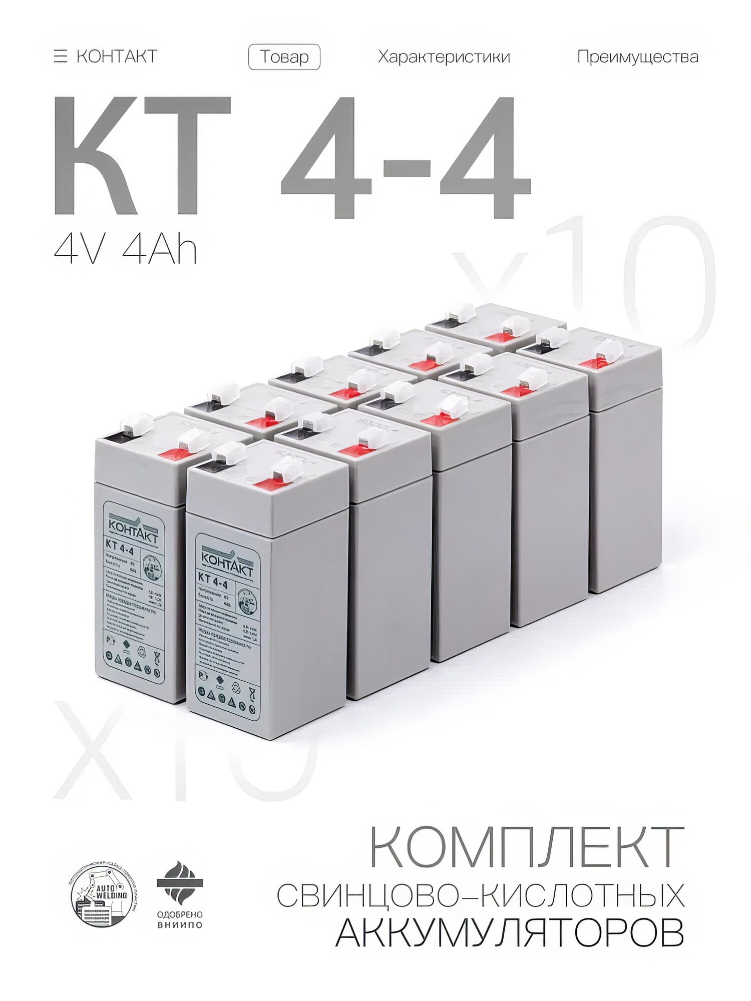 Свинцово-кислотный аккумулятор контакт КТ 4-4 (4 В, 4 Ач) (набор/ комплект из 10 штук) информация: