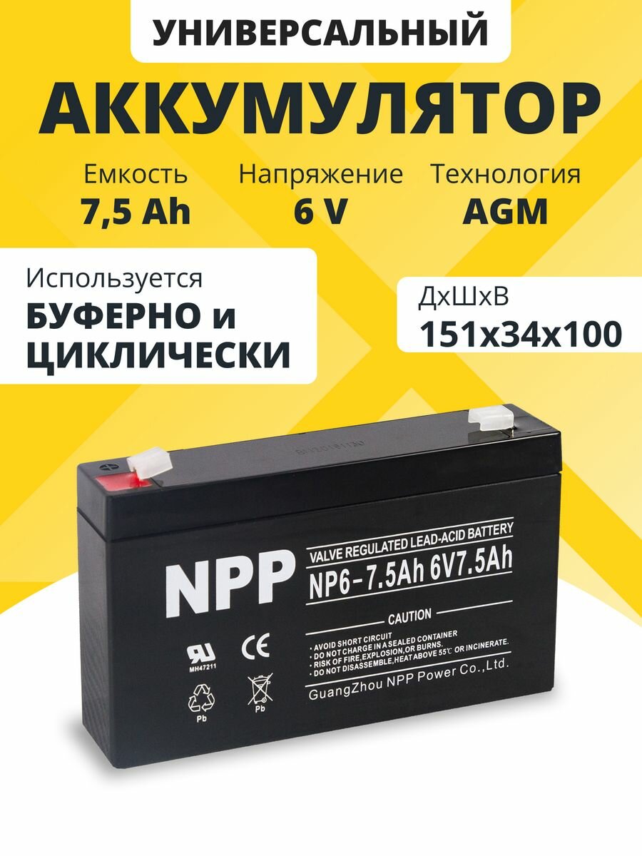 Аккумулятор для ибп 6v 7.5 Ah NPP AGM F1/T1 акб эхолота, фонарей, весов 151x34x100 мм информация: