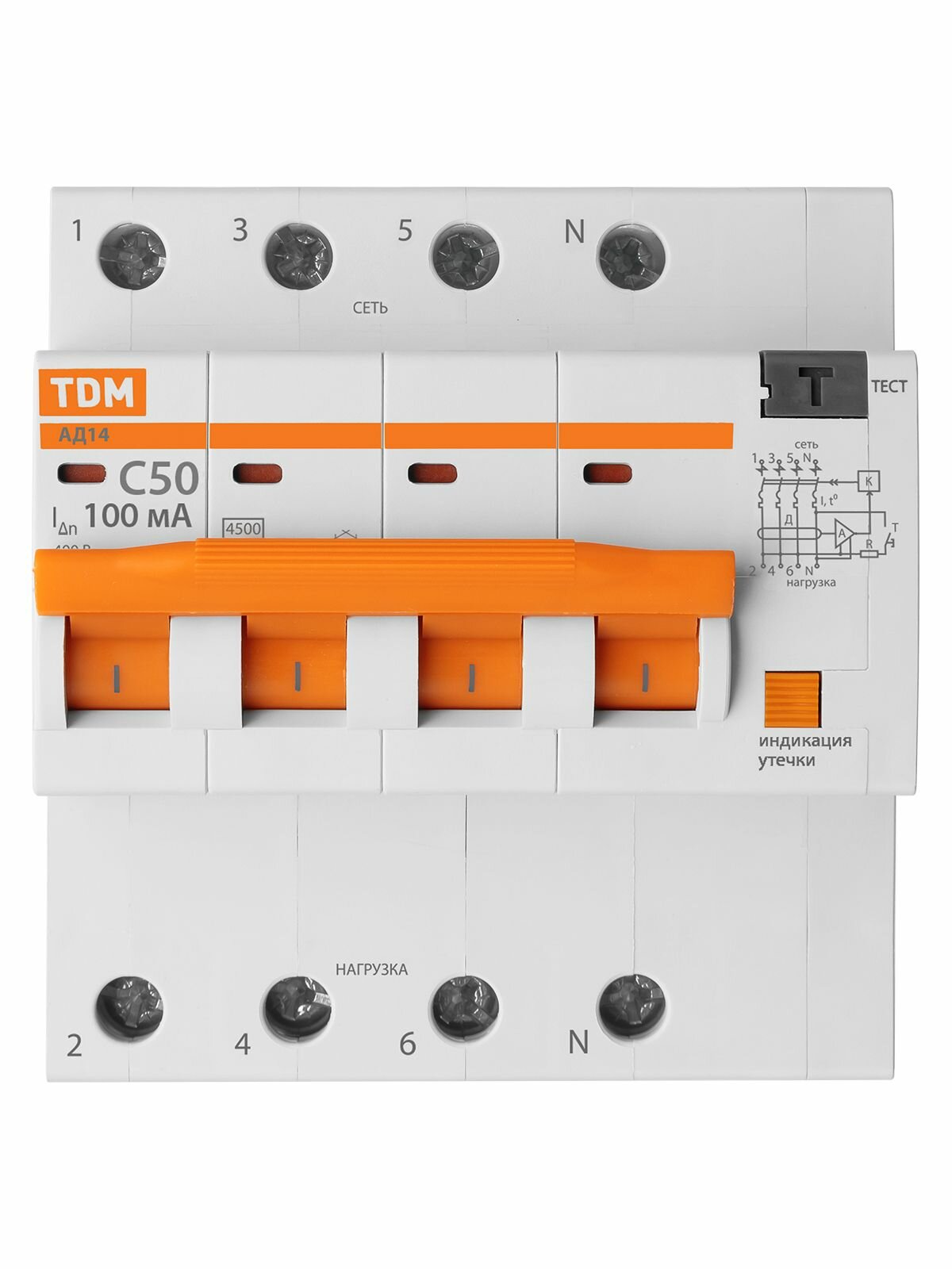 Диф. автомат АД14 4P, C50, 100мА, 4,5кА, тип АС, 5 мод, TDM информация: