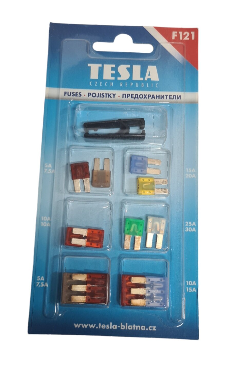 Предохранители штыревые MINI F121 набор (5А-2шт.7.5А-2шт.10А-3шт.15А-2шт.20А-1шт.25А-1шт.30А-1шт.) "TESLA" информация: