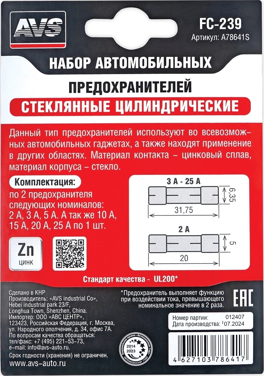 Набор предохранителей AVS FC-239 (цилиндрические стеклянные) в бли информация: