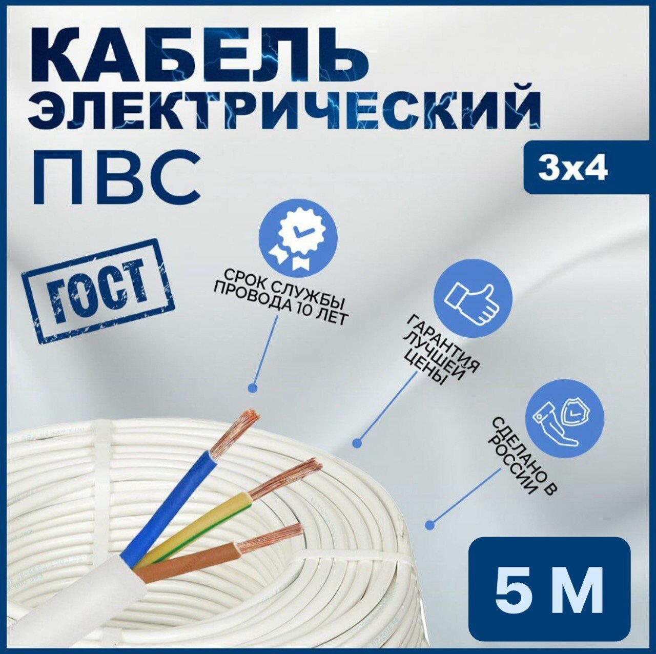 Кабель силовой ПВС 3х4, ГОСТ, 5 метров информация: