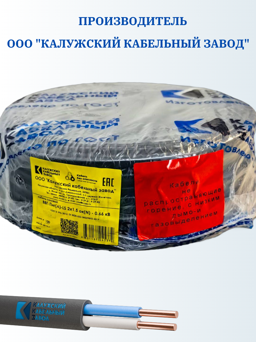Кабель силовой ВВГ П нг LS 2х1,5-100 , Калужский кабельный завод 6 300 ₽