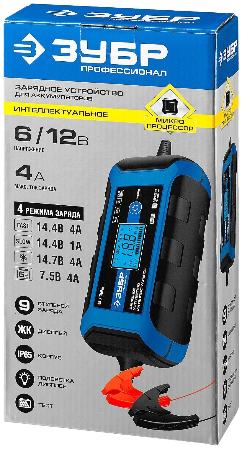 ЗУБР 6В/12В, 4A, автомат, IP65, интеллектуальное зарядное устройство 59300 Профессионал