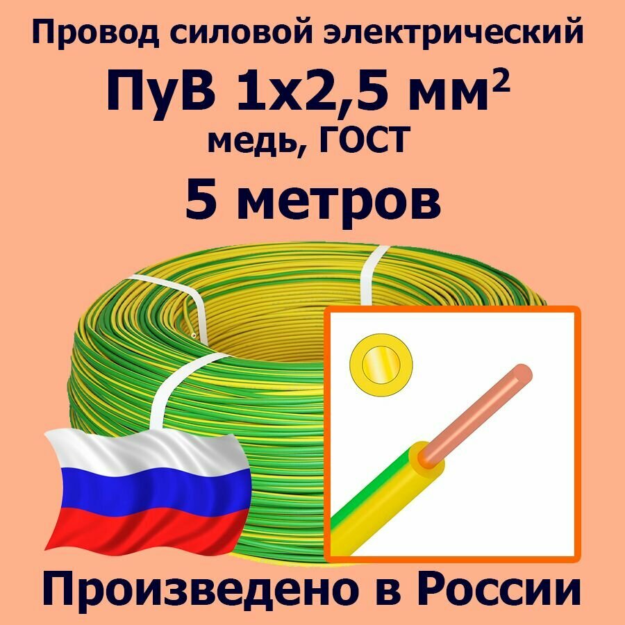 Провод силовой электрический ПуВ 1х2,5 мм2, желто-зеленый, медь, ГОСТ, 5 метров информация: