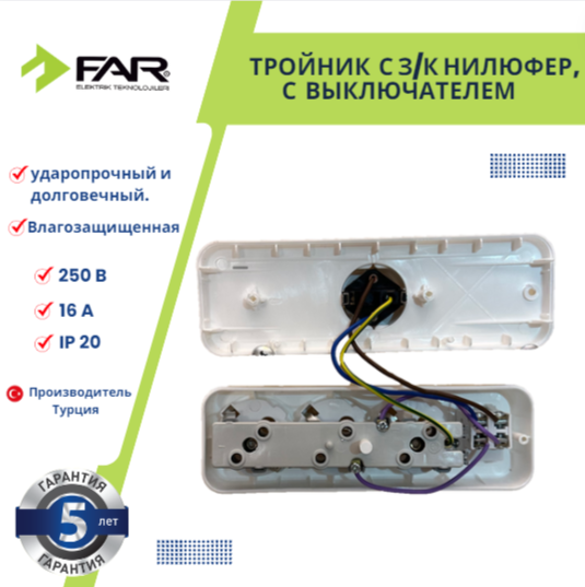 Тройник с заземлением FAR "Нилуфер" , с выключателем , белый, 3 розетки информация: