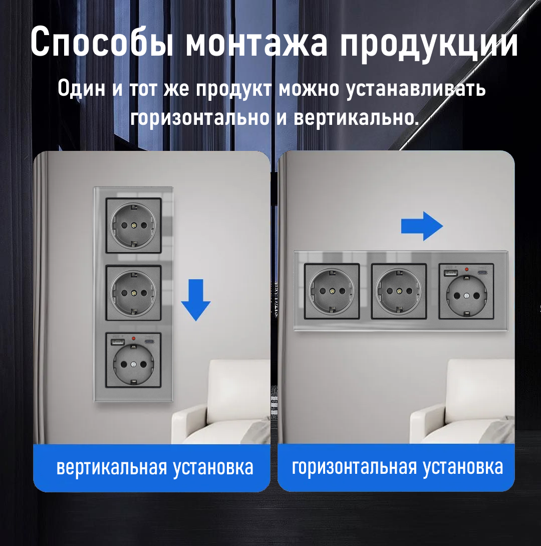 Отзывы на Розетка тройная с USB и type-C входами, 3 поста рамка закаленное стекло 224mm*82mm, цвет серый. F6